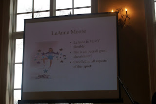 This evening Leanne and I attended the awards banquet for the cheer season. They hold the event at the beautiful Pinnacle Country Club just down the road from our house. The evening is filled with good food, good friends, laughs and tears. It is so nice for the coaches and the gym owner to get up and recognize all of the hard work and dedication the girls give to the team or teams they are on. There were over 250 people there today representing all of our teams from the special needs Shining Stars all the way to the senior level 5. Each girl goes in front of the crowd and the coaches say something special about them and give them a trophy. They also award scholarships to all of the graduation seniors. As you can imagine it is a long evening, so Chad opted to stay home with the other kids. Actually, he said "please do not make me go!". It did last just about 4 hours, but it was worth it.